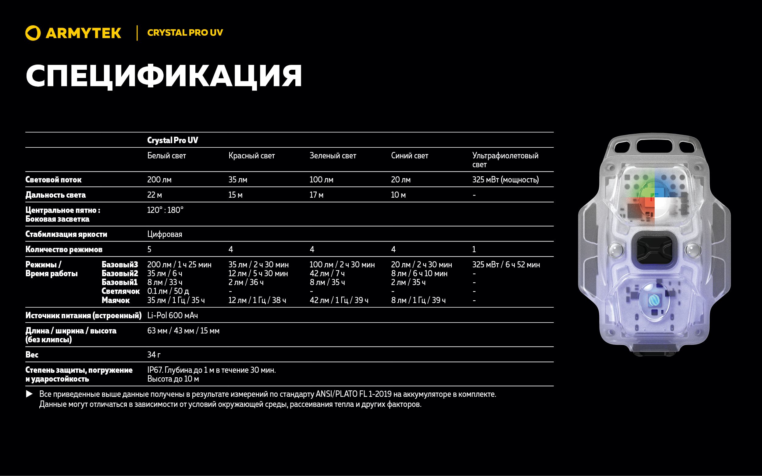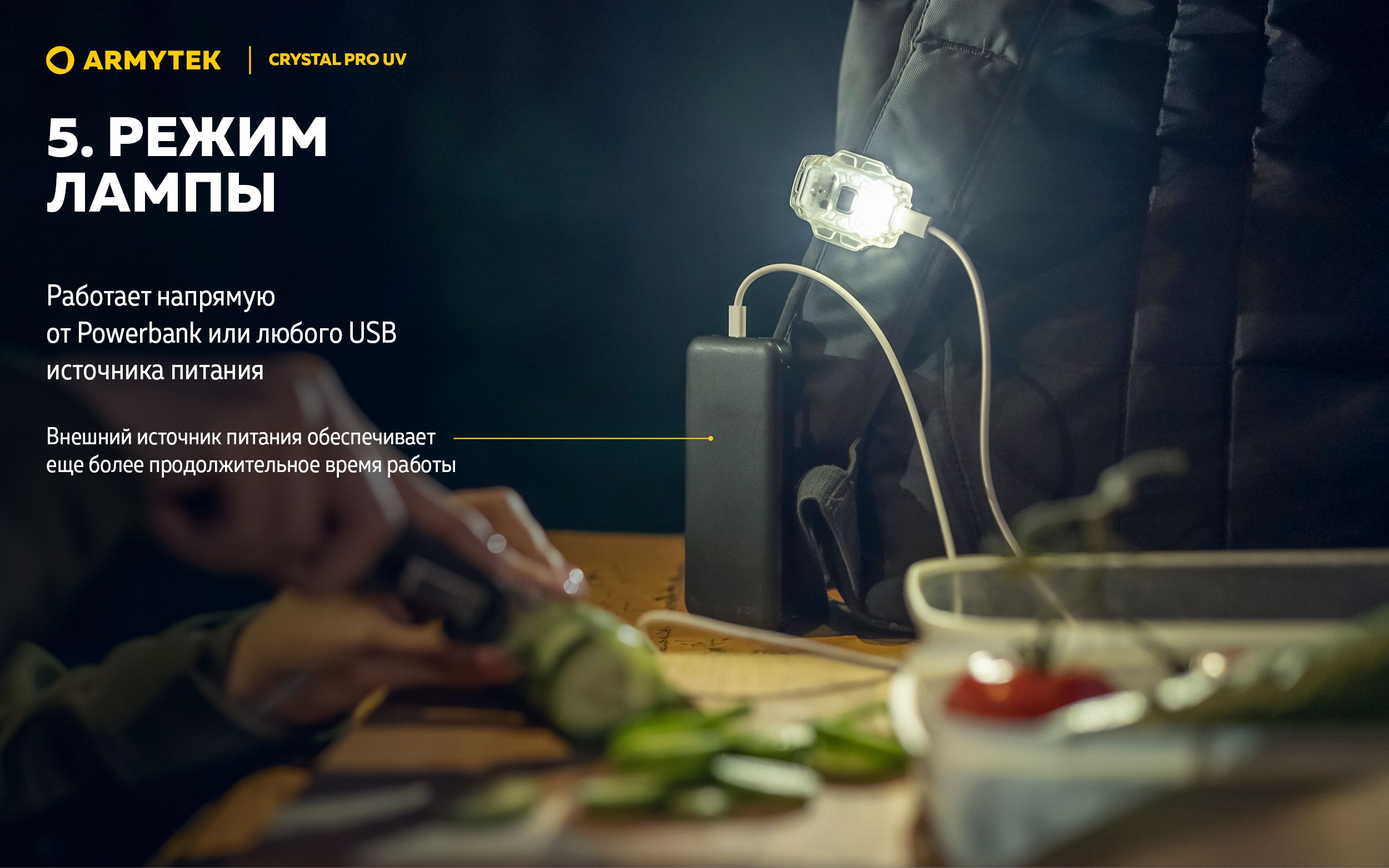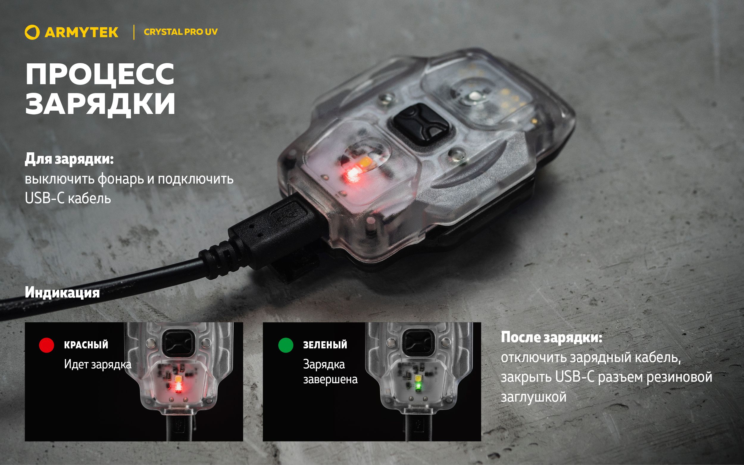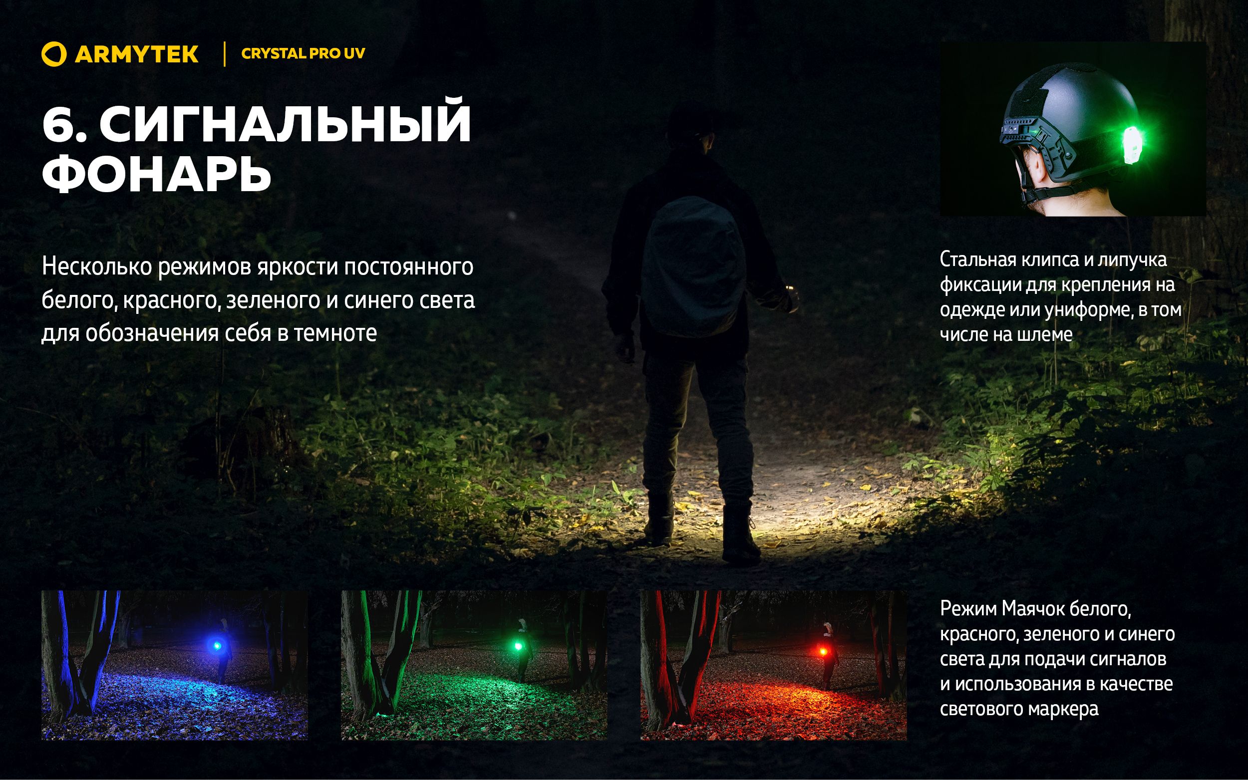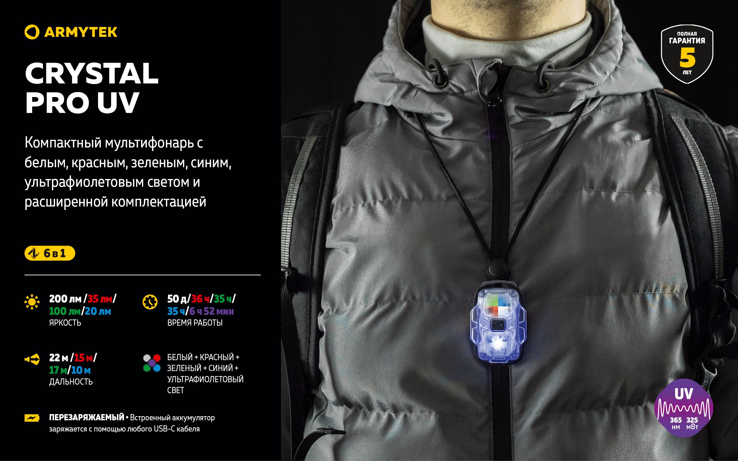 EDC фонарь 6 в 1 ARMYTEK® Crystal PRO UV - это универсальный фонарь, который сочетает в себе самые популярные варианты света. Белый, красный, зеленый, синий и ультрафиолетовый световые потоки дают еще больше возможностей применения фонаря в быту или в профессиональной деятельности.Crystal Pro UV можно использовать в качестве налобного фонаря, фиксировать на ремне или одежде, в том числе специализированной униформе, носить на ремешке или вместе с ключами. Модель также устанавливается на велосипеде с использованием силиконовых колец. Материал корпуса и особое расположение диодов обеспечивают широкий угол света в 180°, оптимальный для применения на близком расстоянии. Фонарь работает до 50 дней на одном заряде в режиме минимальной яркости. Встроенный Li-Pol аккумулятор заряжается с помощью любого USB-C кабеля.