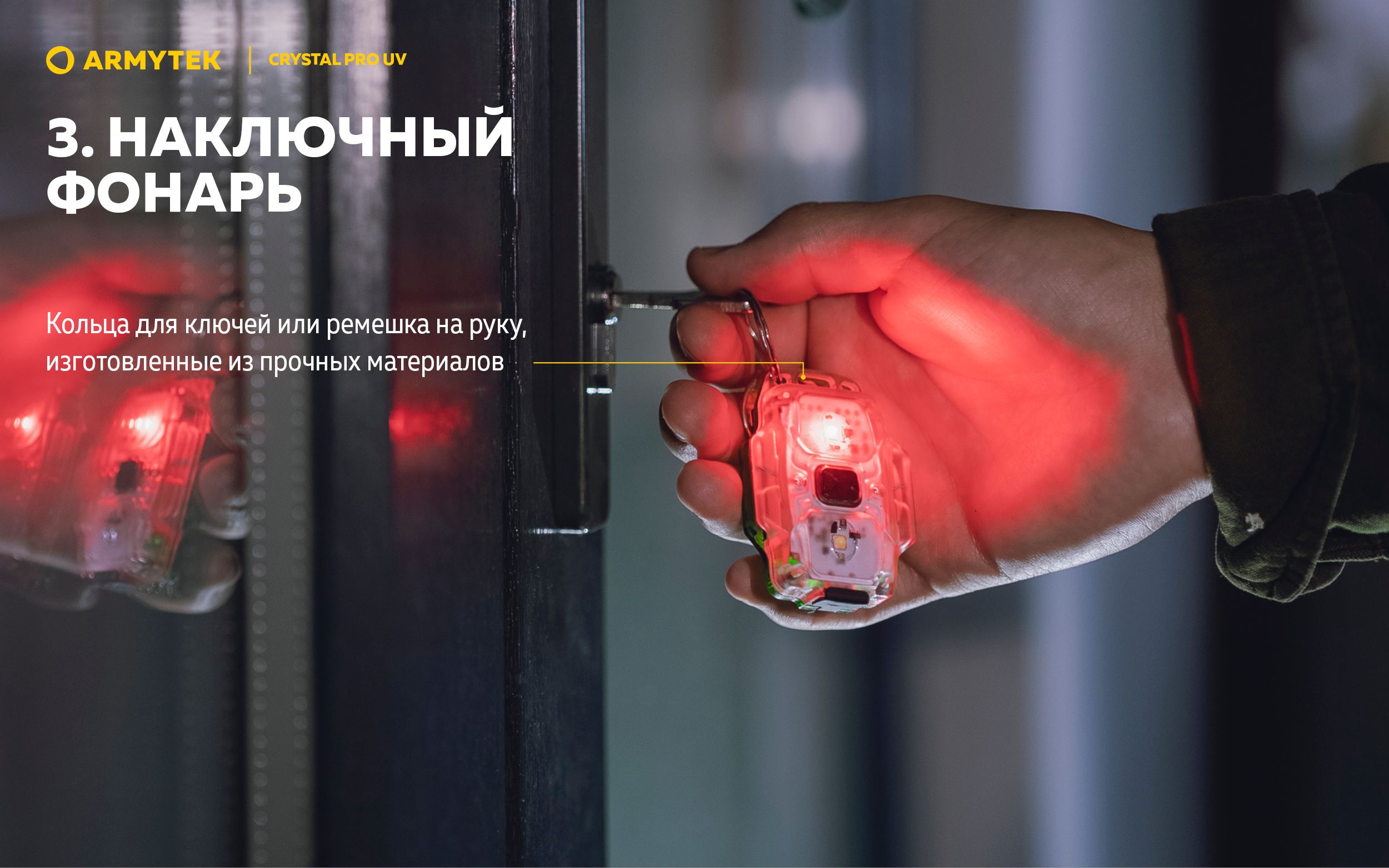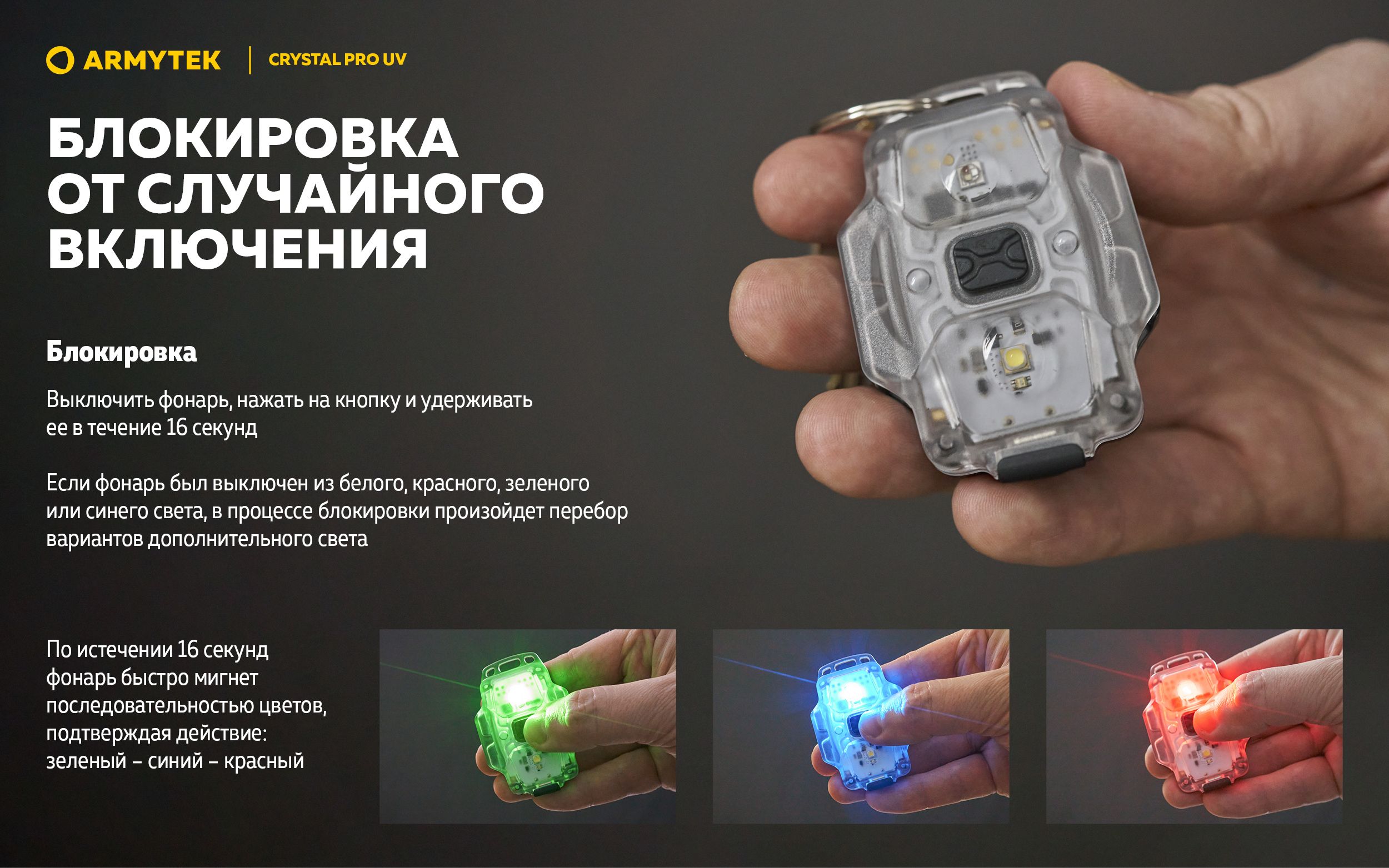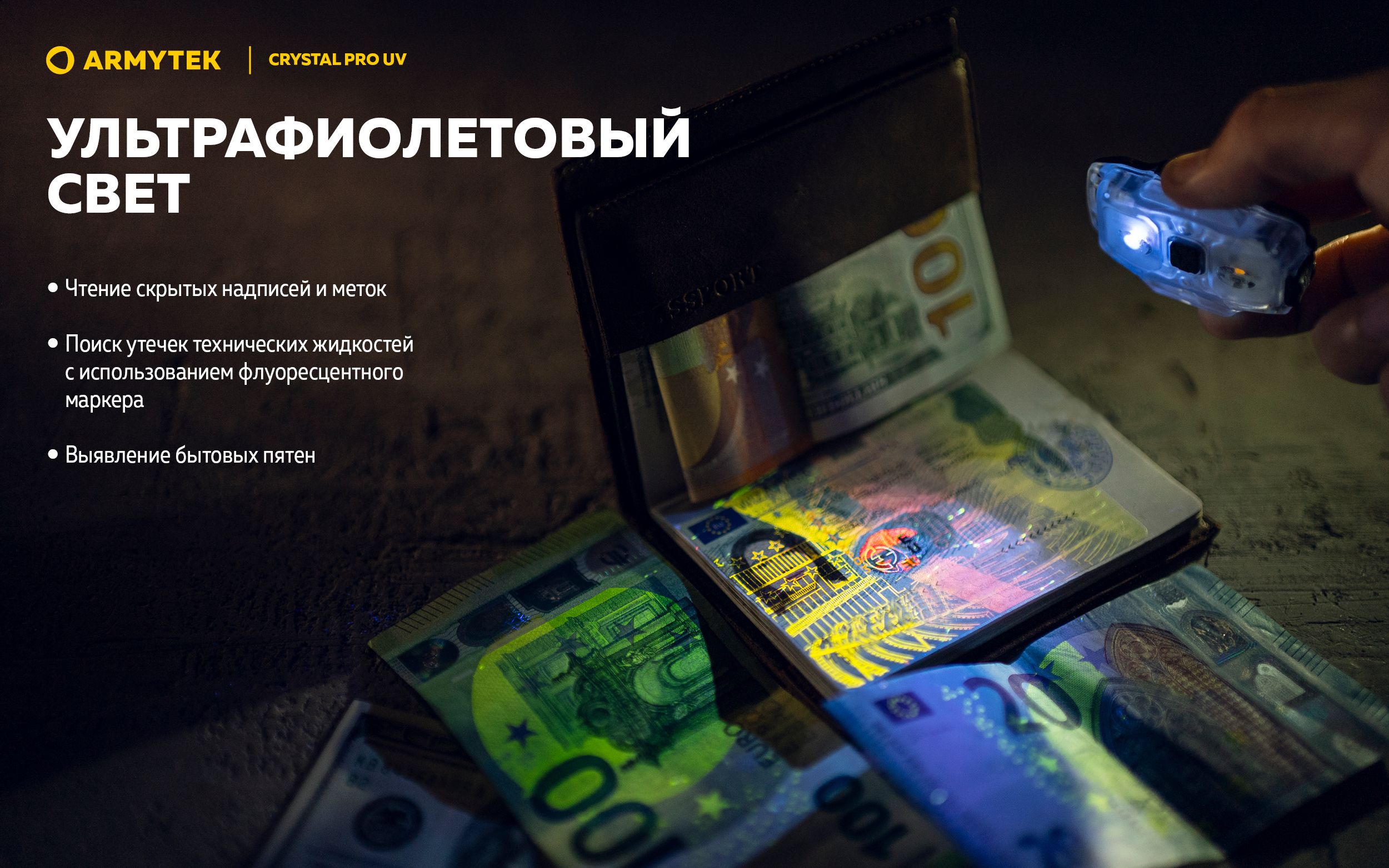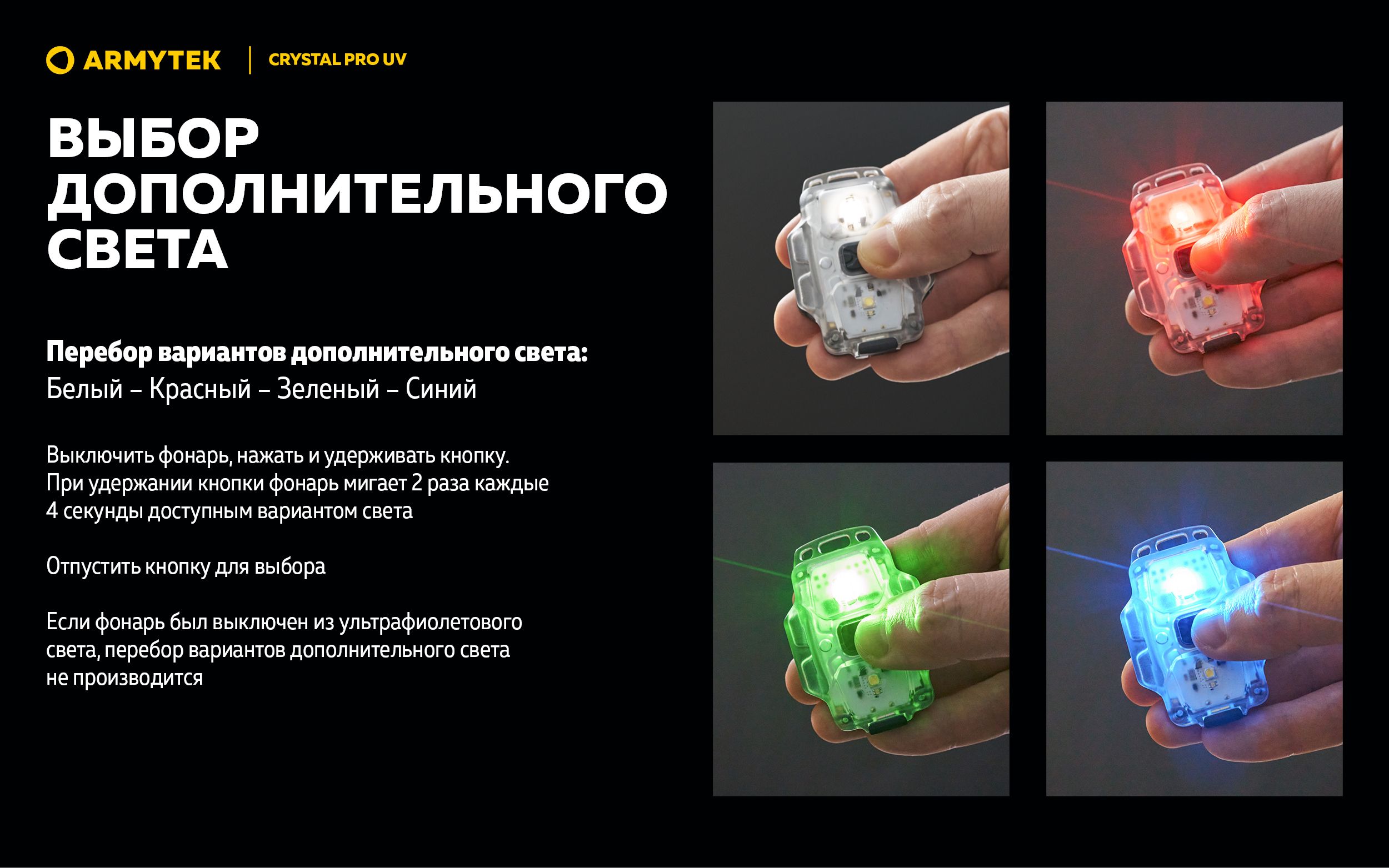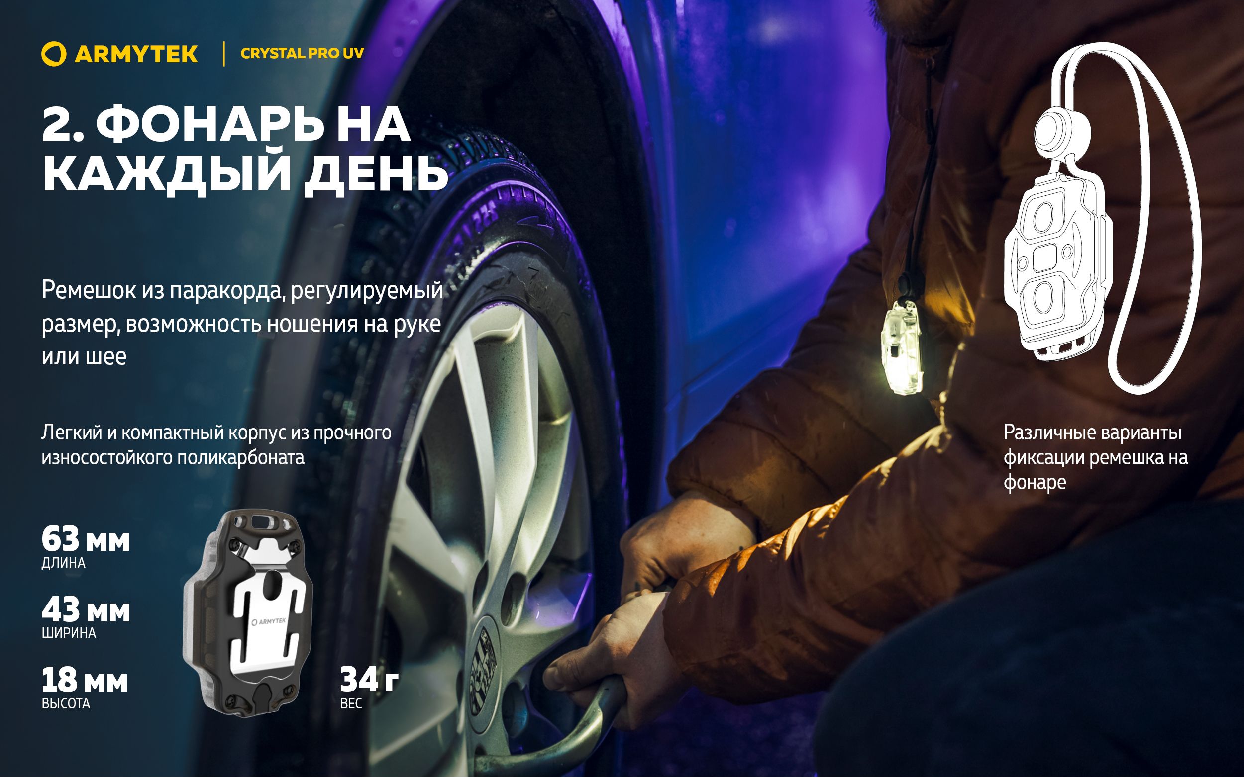 EDC фонарь 6 в 1 ARMYTEK® Crystal PRO UV - это универсальный фонарь, который сочетает в себе самые популярные варианты света. Белый, красный, зеленый, синий и ультрафиолетовый световые потоки дают еще больше возможностей применения фонаря в быту или в профессиональной деятельности.Crystal Pro UV можно использовать в качестве налобного фонаря, фиксировать на ремне или одежде, в том числе специализированной униформе, носить на ремешке или вместе с ключами. Модель также устанавливается на велосипеде с использованием силиконовых колец. Материал корпуса и особое расположение диодов обеспечивают широкий угол света в 180°, оптимальный для применения на близком расстоянии. Фонарь работает до 50 дней на одном заряде в режиме минимальной яркости. Встроенный Li-Pol аккумулятор заряжается с помощью любого USB-C кабеля.