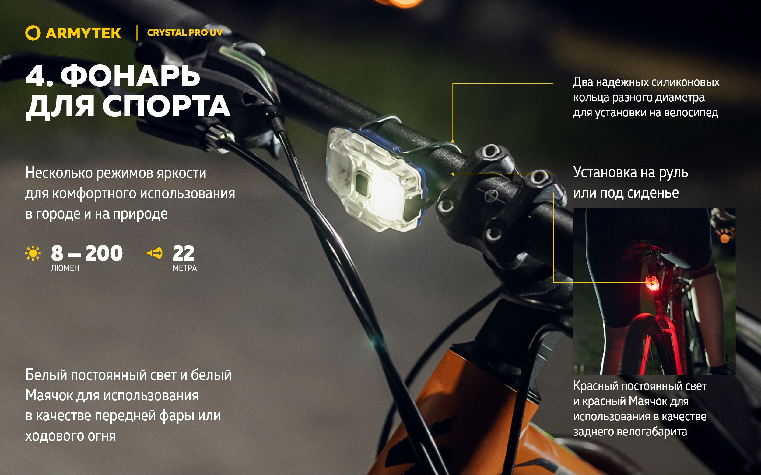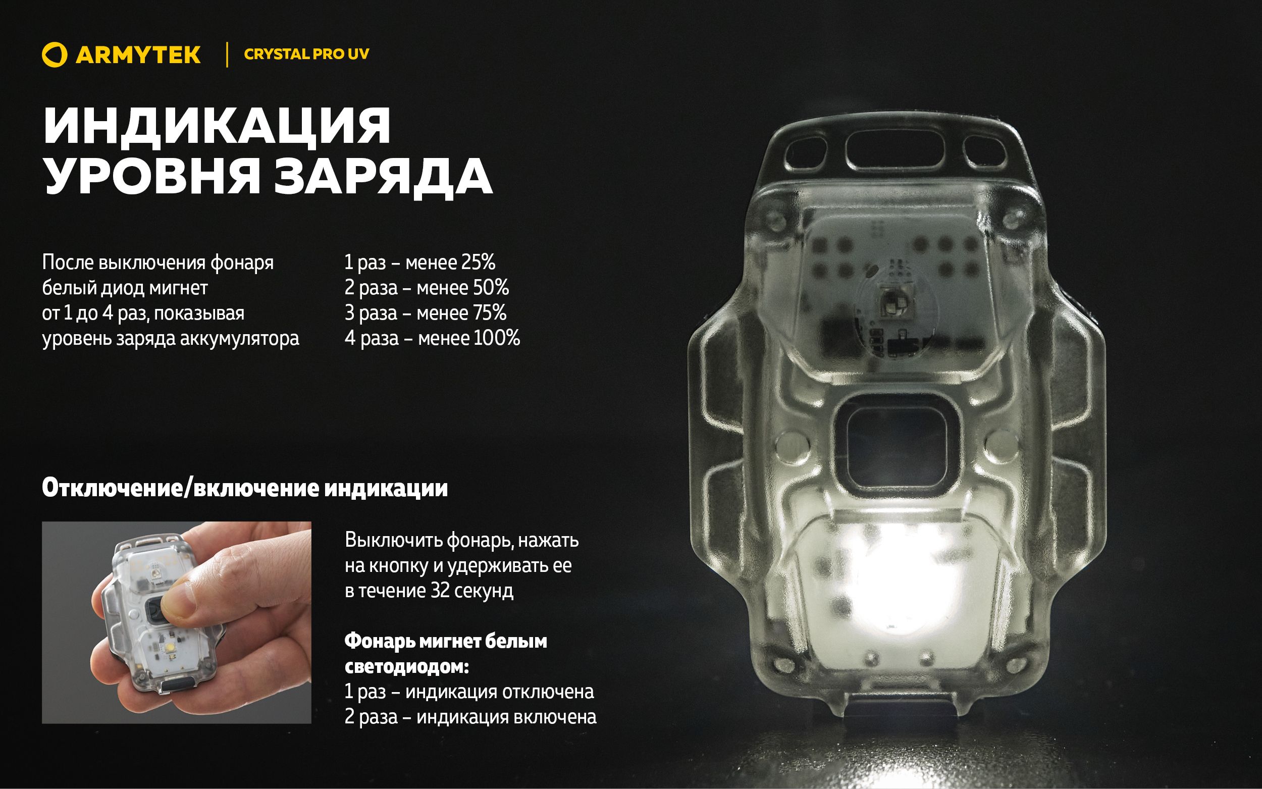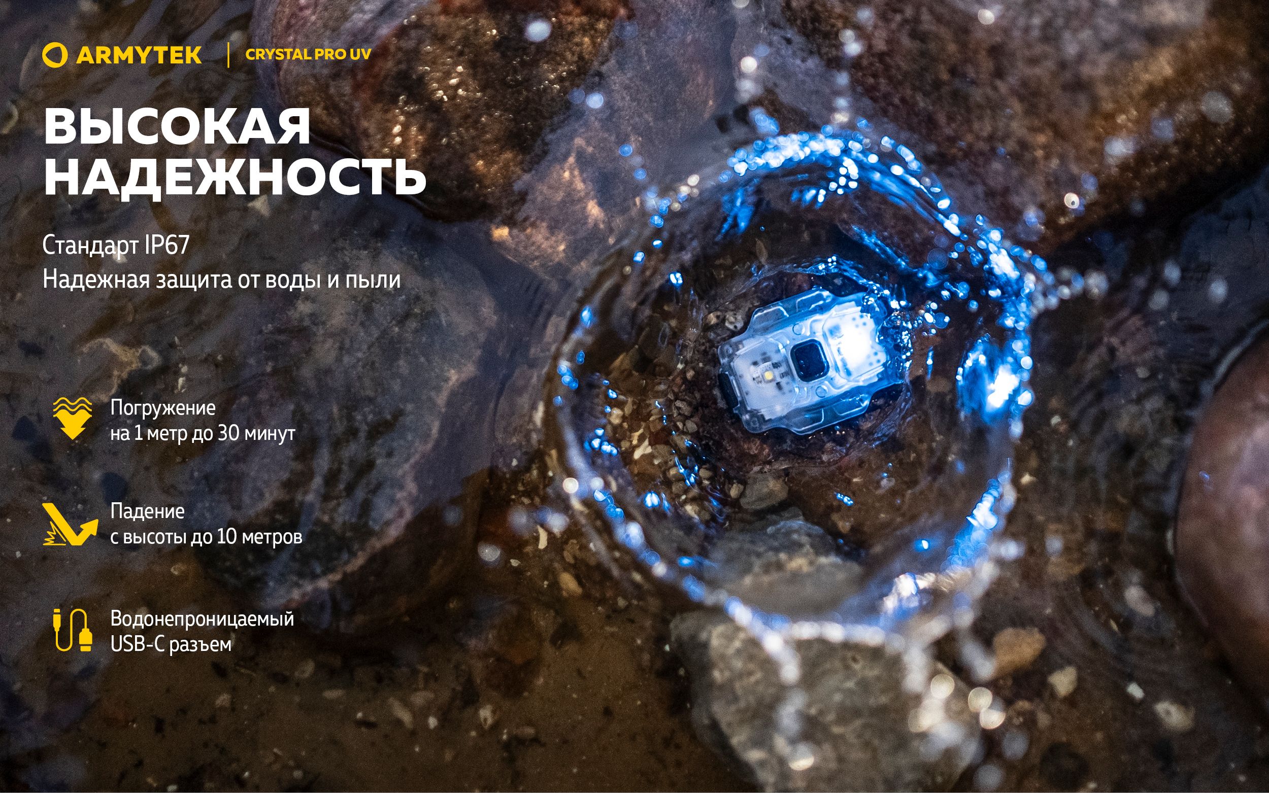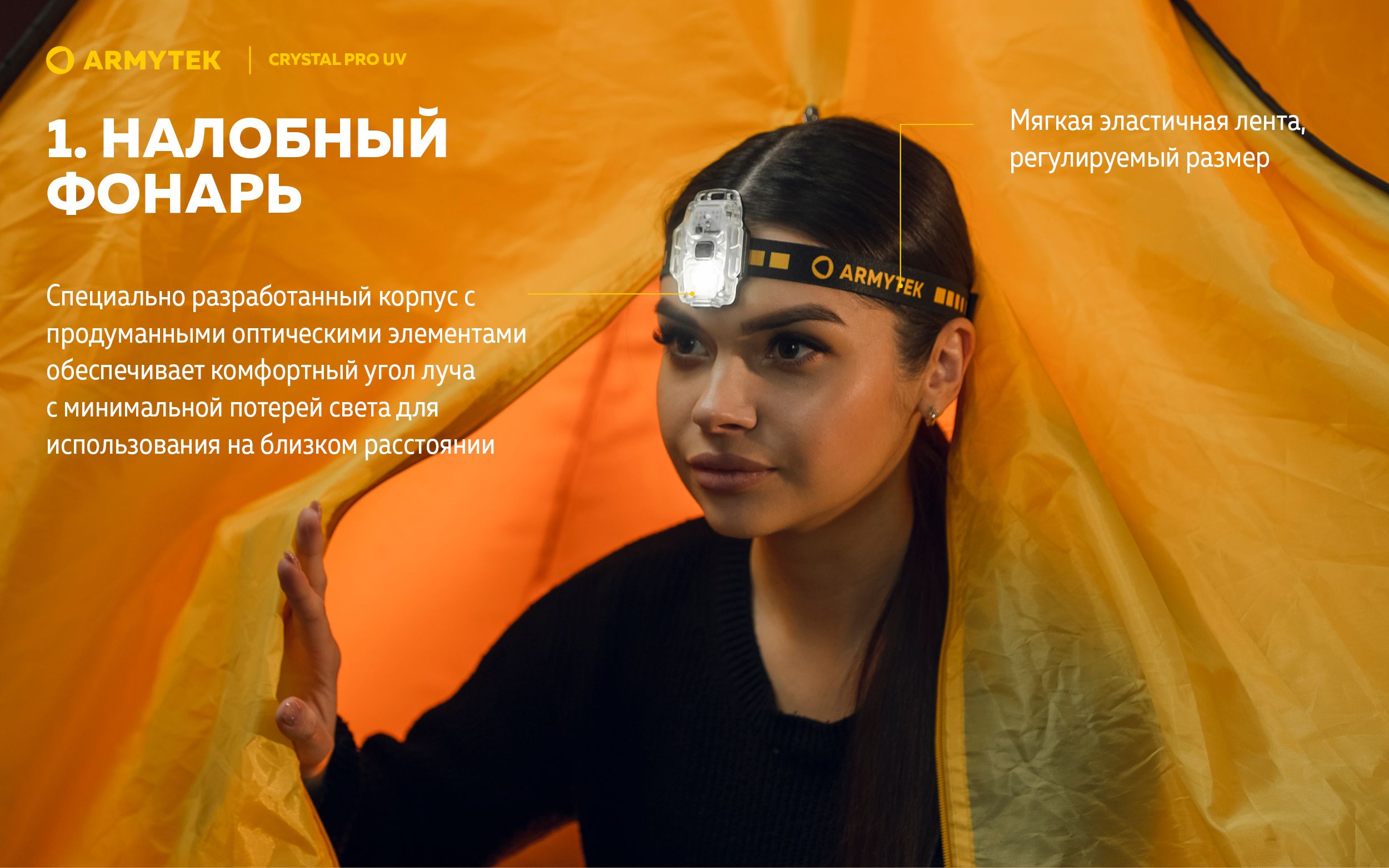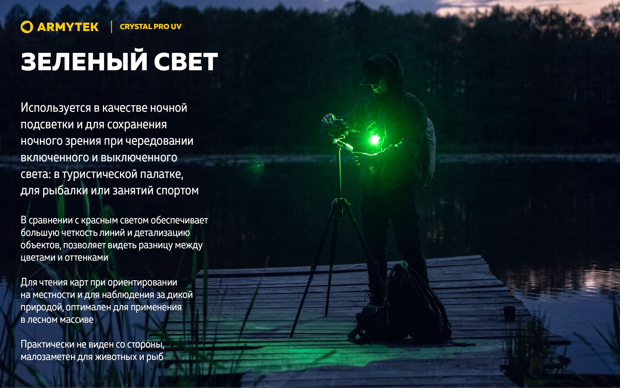 EDC фонарь 6 в 1 ARMYTEK® Crystal PRO UV - это универсальный фонарь, который сочетает в себе самые популярные варианты света. Белый, красный, зеленый, синий и ультрафиолетовый световые потоки дают еще больше возможностей применения фонаря в быту или в профессиональной деятельности.Crystal Pro UV можно использовать в качестве налобного фонаря, фиксировать на ремне или одежде, в том числе специализированной униформе, носить на ремешке или вместе с ключами. Модель также устанавливается на велосипеде с использованием силиконовых колец. Материал корпуса и особое расположение диодов обеспечивают широкий угол света в 180°, оптимальный для применения на близком расстоянии. Фонарь работает до 50 дней на одном заряде в режиме минимальной яркости. Встроенный Li-Pol аккумулятор заряжается с помощью любого USB-C кабеля.